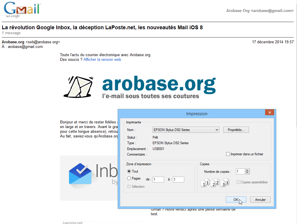 Une nouvelle fenêtre (ou un nouvel onglet) s’ouvre alors, n’affichant que le logo Gmail, l’objet du message et message lui-même. Simultanément, une fenêtre de dialogue Impression vous permet de d’envoyer la commande à l’imprimante. Cliquez pour cela sur le bouton OK.