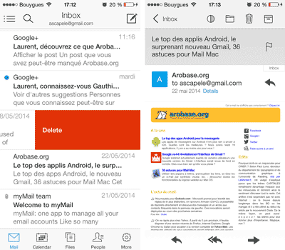 Son utilisation se révèle très agréable. On peut archiver ou supprimer un message par simple balayage depuis la boîte de réception. Une pression prolongée sur un message affiche les commandes courantes :marquer pour suivi ou comme lu, déplacer dans un dossier ou archiver. On regrette juste l’absence de navigation horizontale par balayage. Il faut remonter à la liste des messages après avoir affiché un message.