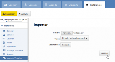 Au préalable, vous devez enregistrer vos contacts dans un fichier au format csv ou ldif, depuis votre logiciel de messagerie ou le webmail que vous utilisiez auparavant. Consultez la page sur le carnet d’adresses pour savoir comment faire.