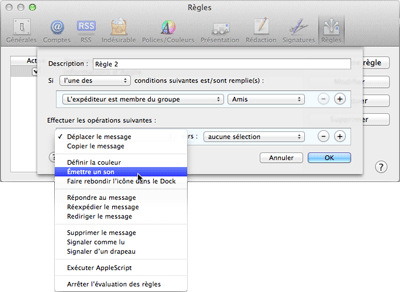 Une fois vos critères définis, précisez le type d’action appliqué aux e-mails sélectionnés par la règle. Vous pouvez ainsi déplacer le message dans un dossier particulier, supprimer le message, le transférer, émettre un son, etc. Vous pouvez bien entendu appliquer simultanément plusieurs opérations.