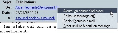 A partir d’un courrier reçu Vous voulez ajouter à votre carnet d’adresses l’adresse e-mail d’un correspondant qui vient de vous envoyer un message ? Ou d’un correspondant qui était en copie d’un message ? Affichez le courrier qui contient l’adresse que vous voulez inclure dans votre carnet. Cliquez du bouton droit sur l’adresse en question : elle peut être aussi bien présente dans le champ De que dans les autres champs. Dans le menu contextuel qui apparaît, choisissez alors Ajouter au carnet d’adresses….