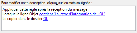 Cliquez sur un lien souligné en bleu pour préciser les règles. Un clic sur contient des mots spécifiques vous permet ainsi d’entrer la liste de mots qui servira à identifier le message.